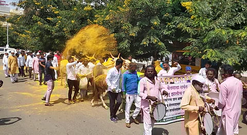 तहसिलदार कार्यालयाच्या परिसरात वाजंत्रीच्या गजरात शर्यतीच्या बैलांची मिरवणूक काढण्यात आली. या मिरवणूकीत बैलगाड्यांच्या पुढे पळणारे घोडेही संबंधित मालक घेऊन आले होते. 'यळकोट यळकोट जय मल्हार' च्या गजरात यावेळी भंडा-याची मुक्त उधळण करण्यात आली. तहसिलदार लैला शेख यांना गाडामालकांच्या वतीने निवेदन देण्यात आले. बैलगाडा शर्यती सुरू करण्याबाबत राज्य शासन चालढकल करीत असल्याचा आरोप आंदोलकांनी केला.