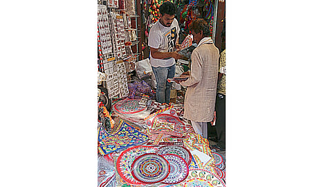 शहरभर अनेक ठिकाणी हातगाडीवाल्यांनी रांगोळ्या, रंगमिश्रित रांगोळी, विविध रंगांची तसेच रांगोळ्यांच्या स्टिकर्सची दूकाने थाटली आहेत. राळेपासून तयार केलेली रांगोळी आणि रांगोळ्यांच्या स्टिकर्स असे दोन्हीही पर्याय ग्राहकांना उपलब्ध झाले आहेत. ग्राहकांच्या खिशाला परवडेल, इतक्या माफक दरात रांगोळी व रांगोळीची स्टिकर्स मिळत आहेत.