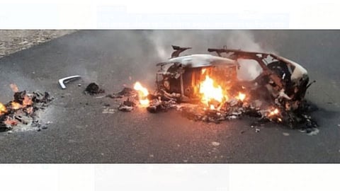 कुरकुंभ - पुणे - सोलापूर राष्ट्रीय महामार्गावर रावणगाव (ता. दौंड) हद्दीत भरधाव वेगात जाणाऱ्या ॲक्टीवा गाडीच्या टायरला अचानक आग लागल्याने गाडी जळून खाक झाली. मात्र सुदैव स्कुटीवरील तिघे बचावले. ही घटना मंगळवारी (ता. 3) सायंकाळच्या सुमारास घडली.