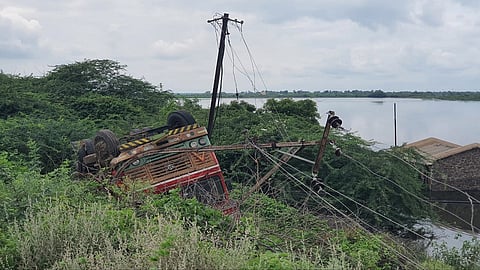 कुरकुंभ (पुणे) : दौंड तालुक्यातील मळद येथे पुणे- सोलापूर राष्ट्रीय महामार्गाच्या डांबरीकरणाच्या कामामुळे वाहतूक सेवा रस्त्याने वळविली आहे. येथे शुक्रवारी (ता. 31) मध्यरात्री एक मालवाहू ट्रक उलटून 22 व 11 केव्ही वीजवाहक तारांच्या खांबाला धडकला.