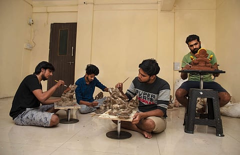 कॅन्टोन्मेंट : कोरोनाच्या पार्श्वभूमीवर मागील साडेचार महिन्यांपासून सर्व व्यवहार ठप्प झाले. मात्र, कलाकार हातावर हात ठेवून बसेल, तर त्याला कलाकार का म्हणायचे असाही प्रश्न अनेकांच्या डोळ्यासमोर तरळल्याशिवाय राहणार नाही. जयेंद्र घोलप आणि नरेश नागपुरे या कलाकारांनी पीओपी, शाडू मातीपेक्षा आणखी काही वेगळ्या पद्धतीने श्रींची मूर्ती साकारता येईल का याचा अभ्यास केला. फक्त अभ्यास करून थांबले नाही, तर त्यांनी ते कृतीतही आणले, हे महत्त्वाचे आहे. या उपक्रमात या दोंघासह निखिल पवार, शुभम कोप्रेकर, मंथन खंडाळे, ह्रितिक ऊत्तरकर हि मंडळी देखील सहभागी आहेत.