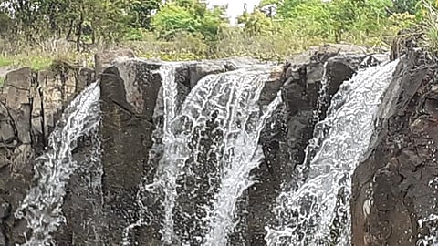 तळेगाव ढमढेरे : कोंढापुरी (ता. शिरूर) येथील मल्हार गडावरील शासकीय तलावातील जादा झालेले पाणी सांडव्याद्वारे पुन्हा ओढ्यात खळखळत वाहत असून, लॉकडाऊनमध्ये हे निसर्गरम्य धबधब्याचे रूप ग्रामस्थांना आकर्षक दिसत आहे.