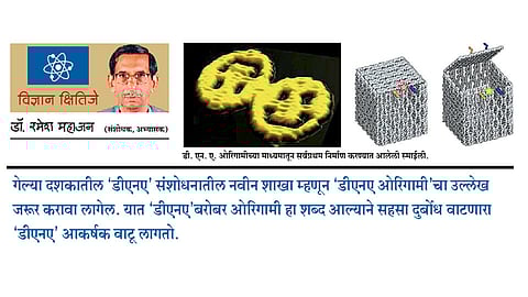 ‘डीएनए’तील (डीऑक्सीरायबो न्यूक्लिक ॲसिड) नव्या संशोधनाचे स्वरूप सोप्या तऱ्हेने व्यक्त करायचे असेल तर त्याला ‘ओरिगामी’ कलेची मदत घ्यावी लागते. ‘ओरिगामी’त एकमितीय कागदाच्या तुकड्यापासून द्विमितीय तसेच त्रिमितीय आकृती बनवल्या जातात आणि त्यामागचे गुपित असते कागदाला घातलेल्या शिस्तबद्ध घड्या! आधुनिक डीएनए संशोधन करणाऱ्यांना हा समान धागा वाटतो. डीएनए ओरिगामीला एक आधारभूत डीएनएचा तुकडा (टेंप्लेट) आणि त्याला ठिकठिकाणी जोडण्यासाठी डीएनएचे छोटे तुकडे (स्टेपल्स) यांची आवश्यकता असते. डीएनएचे छोटे तुकडे जोडता जोडता मधल्या तुकड्याभोवती घड्या पडून नावीन्यपूर्ण आकृती तयार होते.