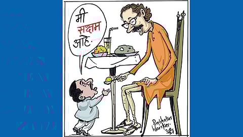 उधोजीसाहेब : (अस्वस्थपणे) छे! कठीण परिस्थिती आली आहे! हल्ली विनोद करणंही महापाप झालंय! लगेच ब्रेकिंग न्यूज सुरू होते- ‘जेवणावरून आघाडीत बिघाडी!’