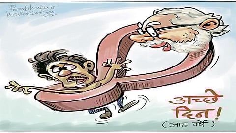 मोटाभाई : (मान्य करत) वात तो साच्ची छे!! मने याद आव्या…कोंग्रेसवाल्यांनी एक ग्रीटिंगकार्ड पाठवला हाय. ए कहे छे के ‘‘आठ वरस तो जुमलाबाजी मां गया! आपडे गुजराथी भासा मां एक कहेवात छे- दाळ बगडे तो दिवस बगडे, अथाणु बगडे तो साल बगडे अने राजा बगडे तो भव बगडे!! कछु सांभळ्यो? ’’