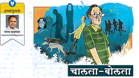 - माझी चाहूल लागली तसे ते दोघं एकदम गप्प झाले. रस्त्याच्या कडेला तरुण पोरांचं एक टोळकं मित्राचा वाढदिवस साजरा करत होतं. ज्याचा वाढदिवस होता त्याच्या तोंडाला त्यांनी संपूर्ण केक फासला होता. त्यामुळे वाढदिवशीच त्या मुलाची अवस्था देवाला बळी द्यायला चालवलेल्या बोकडासारखी झाली होती. काही मुली कानात हेडफोनच्या वायर घालून चटचट चालताना पाहून वाढदिवसवाल्यांना अजून जोर आला. संपूर्ण चेहरा ओढणीनं लपेटून घेतलेली एक तरुणी बाजूनं संथ चालीनं, हळू आवाजात मोबाईलवर बोलत चालली होती. तिला आजूबाजूचं कसलंच भान नव्हतं, तर दुसरी मुलगी चालताना स्वत:शीच खुदकन हसत होती. मध्यमवयीन महिलांचं एक टोळकं या क्षणी त्यांच्यात नसलेल्या महिलांचे दोष एकमेकींना चढाओढीनं सांगत भरभर चालत होत्या. काही माणसं चालताना नखावर नखं घासत होती, काही बॉलिंग टाकल्याप्रमाणे हात फिरवत होती, काही नाकातून जोरजोरानं श्वास सोडून पुन्हा छातीचा भाता भरून घेत होती. एकजण नुकताच सलाईन लावल्यासारखा संथ चालीनं चालला होता, तर दुसरा चालताना मध्येच पोटावर हात फिरवून चालण्याचा काही उपयोग होतोय का ते तपासत होता. काही तरुण, तरुणी, माणसं मात्र चेहऱ्यावर कसलाच भाव उमटणार नाही याची काळजी घेत गांभीर्यानं चालत होती. मी रमतगमत चालत असताना गाडीवर चाललेले दोन तरुण एकदम थांबून मला म्हणाले : 'काय बॉडी बनवायचीय वाटतं या वयात? असं चालून आयुष्य वाढवायचं आणि वाढलेलं आयुष्य चालण्यात घालवायचं याला काही अर्थ आहे का?''