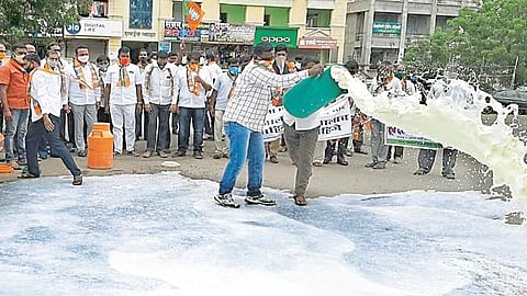 सातारा शहरात आमदार शिवेंद्रसिंहराजे भोसले यांच्या नेतृत्वाखाली शनिवारी पोवई नाका व मोती चौक येथे दूध दरासाठीचे आंदोलन झाले. या वेळी श्री. भोसले म्हणाले, ""सध्या दुधासह शेती उत्पादनांना भाव मिळत नसल्याने शेतकरी अडचणीत आला आहे. कोरोनाचे संकट असताना शेतकरी शांत बसला नाही. विविध अडचणी असूनही शेतकऱ्याने रोजच्या रोज दूध, भाजीपाल्याचा पुरवठा केला. अशा शेतकऱ्यांना न्याय देण्याचे काम राज्य सरकारने करावे.'' या वेळी भाजपचे शहराध्यक्ष विकास गोसावी, पालिकेचे उपाध्यक्ष किशोर शिंदे, प्रवीण शहाणे, विक्रांत भोसले, जयदीप ठुसे, विठ्ठल बलशेटवार, अविनाश कदम, धनंजय जांभळे, विजय काटवटे, मिलिंद काकडे, प्राची शहाणे, ज्ञानेश्वर फरांदे, किशोर गोडबोले, किशोर पंडित, आप्पा कोरे, मनीषा पांडे, चंदन घोडके, रवी आपटे, संतोष प्रभुणे, लक्ष्मण चव्हाण, वैशाली टंकसाळे, सुनील काळेकर, रीना भणगे, सुनिशा शहा, विक्रम बोराटे, दीपिका झाड, डॉ. उत्कर्ष रेपाळ, शैलेंद्र कांबळे, प्रकाश शहाणे, अमोल कांबळे, किशोर गालफाडे, धीरज घाडगे, डॉ. सचिन साळुंखे, प्रशांत जोशी, रोहित साने, तानाजी भणगे, अविनाश पवार, कार्यकर्ते व शेतकरी उपस्थित होते.