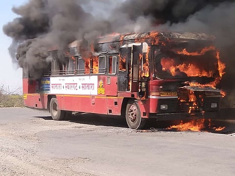 म्हसवड : सातारा -पंढरपुर रस्त्यावरील माण तालुक्यातील धुळदेव येथे आज दुपारी साडेबारा वाजता आगीच्या ज्वालांनी वेढलेल्या बर्निंग एसटी चा थरार एसटी चालकाच्या प्रसंग अवधामुळे ४४ प्रवाशांचे प्राण वाचले व कोणतीही जीवित हानी नाही. मात्र संबंधित संपुर्ण एसटी बस जळून खाक होऊन फक्त सांगाडा शिल्लक राहिला. याबाबत सविस्तर माहिती अशी की, सातारा आगाराची एम एच ११ बी एल ९३ ५५ एसटी बस सोलापूरला जात असताना म्हसवड पासून पूर्वेस सुमारे सात किलोमीटर अंतरावरील धुळदेव या गावाच्या बस थांबाच्याच्या ठिकाणी एक वयोवृध्द त्यांच्या एसटीतून उतरत असताना इंजिन मधून धूर येत असल्याचे चालक शंकर पवार त्यांच्या लक्षात आले. (Satara Bus Fire Accident)