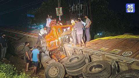 Horrific accident at Khambatki Ghat — truck loses control due to brake failure, collides with ST bus and cars; four injured.