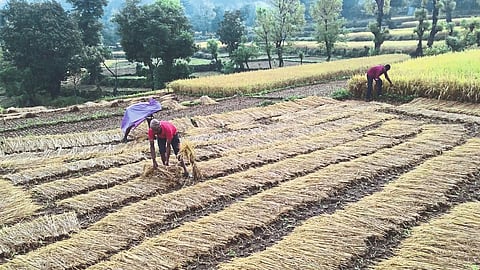काही दिवसांपासून असलेल्या ढगाळ वातावरणामुळे भात काढणी लांबलेली होती. आता कापणी सुरू झाली अन् पावसाने पाठ धरली, त्यामुळे शेतकरी रडकुंडीला आले आहेत. काल रात्री झालेल्या पावसाने कापणी केलेले भात पीक भिजले, उभे पीकही कोलमडले. शेतात मोठ्या प्रमाणे भात झडले आहे. अनेकांच्या मळण्या आणि गंजीही भिजल्या आहेत. भिजलेले पीक उन्हात वाळवायचे झाल्यास ढगाळ वातावरणामुळे तेही शक्य होत नाही. चोहोबाजूंनी संकटात सापडल्यासारखी स्थिती झाली आहे.
