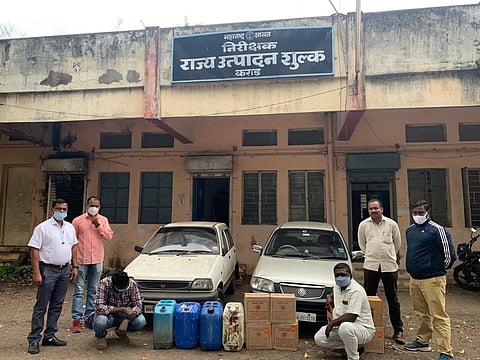 कऱ्हाड : येथील राज्य उत्पादन शुल्कच्या पथकाने नारायणवाडी ताव शहरात दोन वेगवेगळया ठिकाणी छापा टाकून ताडी व देशी दारूची अवैध वाहतूक रोखली. आज सकाळी ही कारवाई झाली. त्यात दोन चारचाकी वाहनांसह तब्बल ७० लीट देशी दारुचे ८ बॉक्स आणि १४० लिटर ताडी जप्त केली आहे. मुबारक दादापीर मकानदार (३२, रा.शनिवार पेठ) व ) सोमनाथ बबन गायकवाड (२८ रा. खोडशी) अशी अटक केलेल्यांची नावे आहेत.