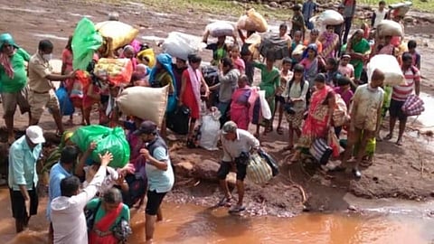 ढेबेवाडी (सातारा) : डोंगर खचून दरडी कोसळण्याची (Jitkarwadi Landslide) मालिका सुरूच असतानाही पूल तुटल्याने गावातच अडकून पडलेल्या जितकरवाडी (ता. पाटण) या दुर्गम गावातील २३ कुटुंबातील ९३ जणांना महसूल व पोलीस प्रशासनाने (Karad Police) जिंती (ता. पाटण) येथील माध्यमिक विद्यालयात (Jinti Secondary School) हलविले. तुटलेल्या पुलाला शिड्या लावून नागरिकांना गावाबाहेर नेण्यात आले. (Landslide At Jitkarwadi In Patan Taluka bam92)