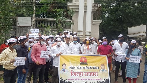या वेळी संघटनेचे जिल्हाध्यक्ष सोहेल पठाण, विराज शेटे, श्रेणिक काळे, सुनील जाधव, उमेश गायकवाड, डॉ. विशाल वीरकर, गौरी भोसले, प्रज्ञा गायकवाड व सर्व तालुकाध्यक्ष व कर्मचारी उपस्थित होते. कोरोना विषाणूचा मुकाबला करण्यासाठी गेल्या वर्षी आरोग्य विभागात कंत्राटी स्वरूपात कर्मचाऱ्यांची नियुक्ती करण्यात आली होती. आम्ही पहिल्या लाटेपासून सेवा देत असूनही सेवामुक्त करण्यात आले आहे. डाटा एन्ट्रीसारखी ऑपरेटरसारखी महत्त्वाची पदे बाह्य यंत्रणेद्वारे प्राप्त निधीतून दहा दिवसांपूर्वी भरण्यात आली आहेत.