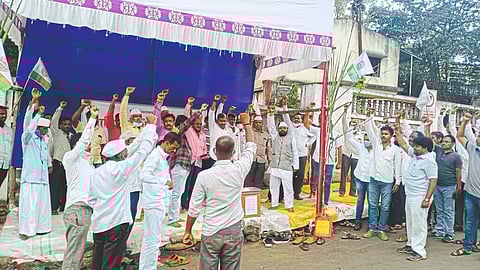महात्मा गांधी जयंतीनिमित्त शेतकऱ्यांवर होत असलेल्या अन्यायाच्या निषेधार्थ स्वाभिमानी शेतकरी संघटनेने जिल्हाध्यक्ष शेळके यांच्या नेतृत्वाखाली जिल्हाधिकारी कार्यालयासमोर सत्याग्रह आंदोलन केले. या वेळी टाळ, मृदंगाच्या साथीत पदाधिकारी व कार्यकर्त्यांनी केलेल्या भजनामुळे परिसरात दणाणून गेला. श्री. शेळके म्हणाले, ‘‘जिल्ह्यातील शेतकऱ्यांना अनेक अडचणींचा सामना करावा लागत आहे. कोरोनाच्या संकटातून हातचा रोजगार गेला, उद्योग व्यवसायांचे मोठे आर्थिक नुकसान झाले.