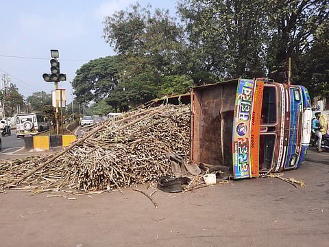 कऱ्हाड : येथील मुख्य विजय दिवस चौकातच दुपारी अडीचच्या सुमारास उसाने भरलेला ट्रक (Sugarcane Truck) पलटी झाला. त्यामुळे त्या भागात वाहतुकीची कोंडी (Traffic Jam) झाली होती. अपघातात (Accident) सुदैवाने कोणतीही जीवितहानी झाली नाही. ट्रकमध्ये तांत्रिक बिघाड झाल्याने तो पलटी झाला. या भागातील वाहतूक सुरळीत करताना पोलिसांना तारेवरची कसरत करावी लागत होती.
