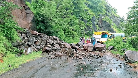 वाई (जि. सातारा) : तालुक्यात रात्रीपासून संततधार पाऊस सुरू असून, अधूनमधून पावसाचा जोर वाढत आहे. आज पहाटेच्या सुमारास मांढरदेव घाटात मोठी दरड कोसळली. मात्र, सुदैवाने कोणतीही जीवितहानी झाली नाही. परंतु, मोठाले दगड रस्त्यावर आल्याने काही काळ या मार्गावरील वाहतूक ठप्प झाली. स्थानिक प्रशासनाने तातडीने घटनास्थळी धाव घेऊन वाहतूक सुरळीत केली.