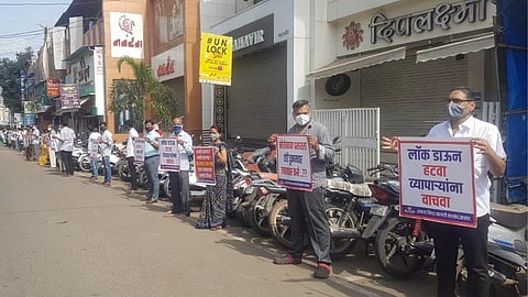 आज (मंगळवार) सातारा शहरात व्यापाऱ्यांनी मूक आंदोलन छेडत प्रशासनाच्या भूमिकेचा जाहीर निषेध नोंदवत न्याय देण्याची मागणी केली. शहरातील विविध छोटे, मोठे व्यापारी आज पालिका, तहसीलदार कार्यालयाबाहेर जमले होते. त्यांनी शासनाच्या विरोधासह लॉकडाउनविरोधी घोषणाबाजी केली. त्यांच्या हातात फलक होते. त्यावर लॉकाडउन हटावो, व्यापार बचावो अशा विविध घोषणाही होत्या.