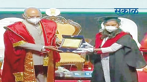 कवठे (जि. सातारा) : वेळे (ता. वाई) येथे वास्तव्यास असलेली व मूळची कर्नाटकमधील असणारी सोनाली देवानंद राठोड हिला राष्ट्रपती रामनाथ कोविंद यांच्या हस्ते सुवर्णपदक देऊन सन्मानित करण्यात आले. सोनाली ही बंगळूर येथील राजीव गांधी विद्यापीठातून बीएस्सी नर्सिंगमध्ये 81 टक्के गुण मिळवून कर्नाटक राज्यात प्रथम क्रमांत मिळवल्याने तिला सुवर्णपदक देऊन सन्मानित करण्यात आले.
