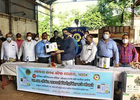 सातारा : आमदार शिवेंद्रसिंहराजे भोसले यांच्या हस्ते लायन्स क्लब सातारा एमआयडीसीचे 12 ऑक्सिजन मशिन्स लोकांच्या सेवेत रुजू झाल्या. यावेळी आमदार शिवेंद्रसिंहराजे यांनी लायन्स क्लब सातारा एमआयडीसीच्या या उपक्रमाचे कौतुक करताना सध्याच्या कोरोना पार्श्वभूमीवर उद्भवलेल्या कठीण प्रसंगी लोकांच्या सेवेसाठी अतिशय उपयुक्त प्रकल्प हाती घेतल्याबद्दल अभिनंदन केले. लोकांना सहकार्य करण्याच्या क्लबच्या सर्व उपक्रमांना लागेल ती मदत देण्याचे आश्वासन ही दिले.