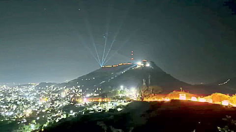 सातारा : शिवजयंतीच्या पूर्वसंध्येला आमदार शिवेंद्रसिंहराजे भोसले मित्र समूहाच्या वतीने अजिंक्यतारा किल्ला शेकडो मशालींनी उजळून काढला. या मशाल महोत्सव, गडपूजन सोहळ्यामुळे अजिंक्यतारा किल्ल्यावर शिवकाल अवतरल्याची अनुभूती सातारकरांना होत होती. येथे शिवजयंतीच्या उत्साहाला उधाण आले असून, राजधानी सातारा भगवी झाली आहे.