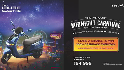 TVS iQube इलेक्ट्रिक स्कूटरने 4,50,000 ग्राहकांचा टप्पा पूर्ण केल्याचा आनंद साजरा करण्यासाठी TVS iQube Midnight Carnival आयोजित करण्यात आला आहे. १२ ते २२ डिसेंबर या 11 रात्री तुम्हाला या खास उत्सवाचा रंग अनुभवायला मिळेल. भारतातील कुटुंबांचे आवडते इलेक्ट्रिक वाहन (India’s Favourite Family EV) म्हणून ओळखले जाणारे TVS iQube हे आरामदायक, सोयीस्कर आणि स्मार्ट तंत्रज्ञानाचा उत्तम मेळ साधणारे वाहन फक्त 94,999 रुपयांपासून (एक्स-शोरूम दिल्ली) सुरू होते.