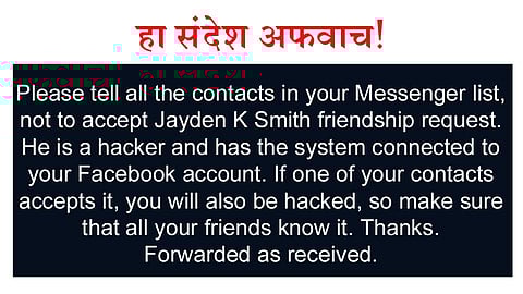 मेन्लो पार्क (कॅलिफोर्निया) - फेसबुकवर जेडेन के. स्मिथ या व्यक्तीची फ्रेंड रिकवेस्ट स्वीकारू नये तो हॅकर आहे, अशा आशयाचा एक संदेश सध्या सोशल मिडियामध्ये फिरत आहे. मात्र ही अफवा असल्याचे समोर आले आहे.