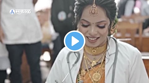 व्हायरल होत असलेल्या व्हिडिओमध्ये एक तरूणी आपल्या लग्नाच्या दिवशी थेट कॉलेजमध्ये प्रॅक्टिकल द्यायला पोहचली आहे. अंगावर लग्नाची साडी, सोने नाणे अन् त्याच्यावर घातलेला लॅब कोट आणि टेथस्कोप. हे पाहून आपणही थक्क व्हाल. पण हो. ही तरूणी खरंच लग्नाच्या दिवशी चक्क प्रॅक्टिकलची परिक्षा देण्यासाठी आली आहे.