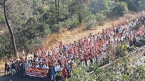 घोटी (जि. नाशिक) : मुंबई-नाशिक महामार्गावरून अखिल भारतीय किसान सभेचा मोर्चा रविवारी (ता.२४) सकाळी साडेआठला जुन्या कसारा घाटातून मुंबईच्या दिशेने निघाला. शेतकऱ्यांच्या ऐतिहासिक लाँग मार्चमुळे महामार्ग ठप्प झाला आहे. तसेच महामार्ग पोलिस घोटी केंद्रातर्फे प्रचंड बंदोबस्त ठेवण्यात आला आहे.