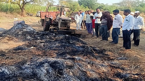 नांदगाव बुद्रुक (ता. इगतपुरी) येथील विलास गेणू पागेरे यांचे भात सोंगणी काम अंतिम टप्प्यात आहे. सोंगलेला भात गुरुवारी (ता. 26) दिवसभर ट्रॅक्टरने वाहतूक करून घरी खळ्यावर आणला होता. सायंकाळी त्या ठिकाणी भाताच्या पेंढ्यांची भवर रचून ठेवली. रात्री दहापर्यंत भात सडकण्याचे कामदेखील सुरू होते. त्यानंतर जेवण करून सर्व जण घरात झोपायला गेले. मध्यरात्री कधी तरी शेतात रचलेली भवर पेटली. त्यासोबत ट्रॅक्टरदेखील जळून खाक झाला. दिवसभर शेतातील कामाने थकलेले पागेरे कुटुंबीय गाढ झोपेत असतानाच मध्यरात्री लागलेल्या आगीत मोठे नुकसान झाले. पहाटे तीन ते साडेतीनच्या सुमारास विलास पागेरे यांच्या मातोश्री उठून बाहेर आल्यावर आगीत भाताची भवर आणि ट्रॅक्टर जळाल्याचे लक्षात आल्यावर त्यांनी, आरडाओरडा करून घरचे लोक उठवीत आग विझविली गेली. मात्र तोपर्यंत संपूर्ण भात, ट्रॅक्टरचे चारही टायर जळून खाक झाले.