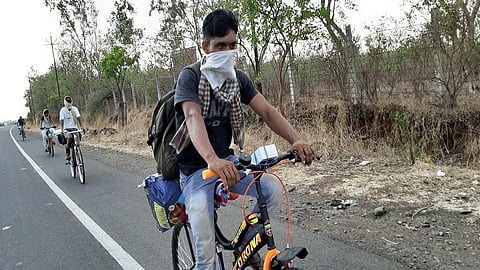 नाशिक : सध्याच्या परीस्थितीत स्थलांतरीतांकडून आपल्या स्वगृही पोहण्यासाठी विविध पर्यायांची चाचपणी केली जाते आहे. त्यातच विरार येथे बांधकाम क्षेत्रात मजुरी करणाऱ्या मुळच्या ओरीसा येथील मजुरांनी चक्क सायकलीवरुन घर गाठण्याचा निर्धार केला. आपल्याकडे जमलेल्या पैश्यांतून गेल्या तीन दिवसांपूर्वी विरार भागातून काही मजुरांनी सायकल खरेदी केली. अन् अकरा मजुर ओरीसाला जाण्यासाठी विरारहून निघाले...घरच्या ओढीने आपली सर्व ताकद पायात एकवटून निरंतर सायकलचा पॅडल मारीत असल्याचे चित्र दिसत आहे.