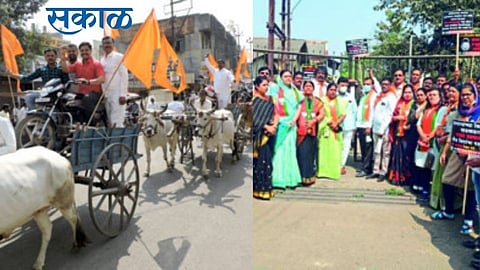 पेट्रोल, डिझेल आणि घरगुती गॅस सिलिंडरच्या वाढत्या दरामुळे महागाईचा आगडोंब उसळत आहे. या निषेधार्थ केंद्रातील मोदी सरकारविरोधात आग्रा रोडवरून बैलगाडी मोर्चा काढल्याचे शिवसेनेने सांगितले. याप्रश्नी पक्षप्रमुख तथा मुख्यमंत्री उद्धव ठाकरे यांनी कार्यकर्त्यांना रस्त्यावर उतरण्याचे निर्देश दिले होते. त्यानुसार आंदोलन झाले. बैलगाड्यांवर दुचाकी ठेवून आणि अग्रभागी दुचाकी ढकलून नेत शिवसेनेचे पदाधिकारी, कार्यकर्त्यांनी पंतप्रधान नरेंद्र मोदी यांच्या विरोधात घोषणाबाजी केली. इंधन आणि सिलिंडरच्या दरवाढीचा परिणाम जीवनावश्यक वस्तूंच्या किमतींवर होत आहे. पर्यायाने महागाई गगनाला भिडली आहे. त्यात सर्वसामान्य होरपळत असून मोदी सरकारने केवळ अच्छे दिनचे गाजर दाखवून जनतेला वाऱ्यावर सोडले आहे. त्यामुळे केंद्र सरकारला जागे करण्यासाठी मोर्चा काढल्याचे जिल्हाप्रमुख हिलाल माळी यांनी सांगितले. त्यांच्यासह सहसंपर्कप्रमुख अतुल सोनवणे, महेश मिस्तरी, राजेंद्र पाटील, किरण जोंधळे, डॉ. सुशील महाजन, अॅड. पंकज गोरे, गुलाब माळी, मनोज मोरे, संजय वाल्हे, रवी काकड, राजेश पटवारी, संगीता जोशी, अरुणा मोरे, सुनिता वाघ, शेखर वाघ, संदीप सूर्यवंशी, संदीप चव्हाण, नंदलाल फुलपगारे, देवा लोणारी, एजाज हाजी, पुरुषोत्तम जाधव, देवराम माळी, राज माळी, हरीश माळी, आबा भडागे, संजय जगताप, हरीश माळी, रामदास कानकाटे, भटू गवळी आदी मोर्चात सहभागी झाले.
