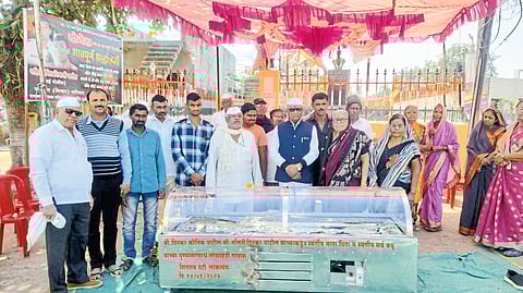 म्हसदी : लोणखेडी (ता. धुळे) येथील निवृत्त प्राचार्यांनी वडिलांच्या पुण्यस्मरणानिमित्त गावासाठी शवपेटीची सुविधा उपलब्ध करून दिली असून, शवपेटीत पार्थिव काही तास ठेवता येणार असल्याने गावाची सोय झाली आहे. शनिवारी (ता. १४) शवपेटीचे लोकार्पण करण्यात आले.