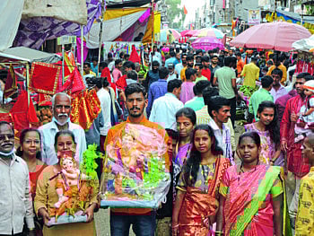 कोरोनासंबंधी विविध नियमांमुळे सार्वजनिक मंडळांची संख्या यंदा रोडावलेली दिसली. मात्र, घरोघरी श्री गणरायाची विधिवत स्थापना होत असल्याने आबालवृद्धांनी बाजारपेठेत उत्साहाने गर्दी केली होती. त्यात महिलांची संख्या लक्षणीय होती. बालकांसह वाहने, हातगाडीवरून काही सार्वजनिक गणेश मंडळांनी ढोल-ताशांच्या गजरात श्री गणरायाची मिरवणूक काढली. त्यामुळे वाद्य विक्रेत्यांचीही चांदी झाली. सार्वजनिक गणेश मंडळांना साधेपणाने आणि ऑनलाइन दर्शनाची सुविधा देऊन गर्दी टाळण्याचे प्रशासनाचे आवाहन आहे. शिवाय शहरासह जिल्ह्यात जोरदार पावसाच्या आगमनामुळेही आर्थिक उलाढालीला सुगीचे दिवस आले आहेत. यात टाळ-मृदंग, पारंपरिक गांधी टोपी परिधान करत पोलिस अधिकारी, राजकीय मंडळी, तृतीयपंथी आणि नागरिकांनी विधिवत, मंत्रोच्चारात, आरतीतून श्री गणरायाची घरोघरी स्थापना केली. पोलिसांनी ठिकठिकाणी चोख बंदोबस्त ठेवला असून, नागरिकांनी शांततेत गणेशोत्सव पार पाडावा, असे आवाहन प्रशासकीय प्रमुख अधिकाऱ्यांनी केले आहे.