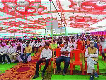 एकीकडे पाच दिवसांवर आलेला गणेश उत्सवही साध्या पद्धतीने करण्याचे आवाहन जिल्हाधिकारी मनिषा खत्री व लोकप्रतिनिधी, पदाधिकाऱ्यांनी शनिवारी (ता.४) झालेल्या बैठकीत केले आहे. मात्र या आवाहनाला एक दिवसही उलटत नाही तोच एका शिक्षक संघटनेने तळोदा रस्त्यावरील खुल्या मैदानावर मोठा मंडप टाकून थाटामाटात हजारो शिक्षक, सामाजिक कार्यकर्ते व नेत्यांना निमंत्रित करीत शिक्षक अधिवेशन भरविले.