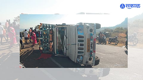 नांदुरी ते सप्तशृंगीगड दरम्यान पीकअप सात किमीचा घाट चढून गेल्यानंतर जलशुध्दीकरण केंद्र व दरडोई करवसुली नाक्याच्या अलीकडेच पाचशे मीटरवरील पठारी भागातील एका वळणावर चालकाचा वाहनावरील ताबा सुटून रस्त्यावरच पलटी झाली.