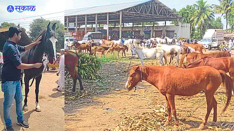 येवला (जि. नाशिक) : हौसेला मोल नसते म्हणूनच कितीही लाख किंमत असली तरी देखण्या, ऐटबाज अन् ताकदवान घोडे खरेदी करणाऱ्यांची आणि सांभाळणाऱ्यांची संख्या देशभरात कमी नाही, याचा प्रत्यय आज येथील कृषी उत्पन्न बाजार समितीत भरणाऱ्या देशात लोकप्रिय असलेल्या घोडेबाजारातून आला. येथे विक्रीसाठी उदयपूरच्या राजेशाही वंशाच्या ६१ लाखांच्या किमतीच्या घोडीने बाजारात लक्ष वेधले. (61 lakh horse attracted attention Millions of turnover in horse market yeola Nashik Latest Marathi News)