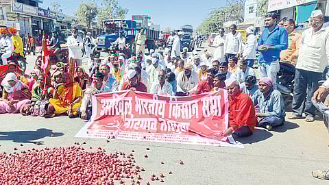 मनमाड (जि. नाशिक) : केंद्र व राज्य सरकारच्या चुकीच्या धोरणांमुळे कांद्याच्या भावात सतत घसरण होत असल्याच्या निषेधार्थ अखिल भारतीय किसान सभेच्या नेतृत्वाखाली शनिवारी