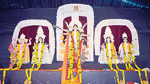 बंगालमधील नदीतून आणलेली माती तसेच बांबू, गवत, वॉटर कलर यापासून देवीची मूर्ती गांधीनगरला बनवितात. माती आणून यंदा देवीची १४ फुटांची मूर्ती साकारली आहे. देवीशेजारी सरस्वती, लक्ष्मी, कार्तिक स्वामी, गणेश यांच्या मूर्ती आहेत. उत्सव समितीचे अध्यक्ष सुजाय गुप्ता, कार्यकारी उपाध्यक्ष पी. के. दास, प्रदीप बिस्वास, सरचिटणीस दीपक घोष, खजिनदार बिरू दास गुप्ता, महिला विभागाच्या अध्यक्षा डॉ. रिता कंडू, चिटणीस श्वेता गुप्ता यांच्या मार्गदर्शनाखाली सांस्कृतिक व धार्मिक कार्यक्रम होत आहेत. (bengali people Durga Puja Utsav 2022 begins in Gandhinagar Nashik Latest Marathi News)