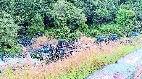 इगतपुरी शहर (जि. नाशिक) : मुंबई आग्रा महामार्गावरील नवीन कसारा घाटातील ब्रेक फेल पॉइंटजवळ शनिवारी (ता.२९) सकाळच्या सुमारास सिमेंटच्या पेवरब्लॉकने भरलेला कंटेनर (MH 48 HF 1513) चालकाचे नियंत्रण सुटल्याने संरक्षक भिंत तोडून थेट ५० फूट दरीत जाऊन कोसळला. या अपघातात कंटेनरचालक कंटेनरखाली अडकला होता. त्याला वाचविण्यात आपत्ती व्यवस्थापनाच्या टीमला यश आले. (Container falls into valley at Kasara Ghat disaster team managed to save driver Nashik Latest Marathi News)