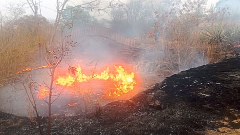 देवळाली कॅम्प (जि. नाशिक) : येथील खंडेराव टेकडी परिसरात असलेल्या कॅटोन्मेंट बोर्डाच्या (Cantonment Board) टेम्पल हिल (Temple Hill) उद्यानात आग लागली. या वेळी कॅन्टोन्मेंट बोर्डाच्या अग्निशामक वाहनासह कर्मचाऱ्यांनी दाखल होत ही आग आटोक्यात आणली. देवळाली (Deolali) येथील खंडेराव टेकडी जवळ असलेल्या या उद्यानात सायंकाळी परिसरातील लहान मुलांसह पर्यटक येतात, मात्र सुदैवाने या वेळी येथे कोणी नसल्याने होणारी गंभीर घटना टळली.