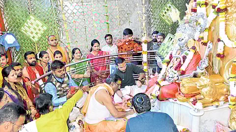 गंगापूर रोडवरील आनंदवली शिवारातील नवश्या गणपतीच्या दर्शनासाठी भल्या पहाटेपासून भाविकांनी मोठी गर्दी केली होती. दुपारी दर्शनरांगा दूरवर पोचल्या होत्या. पहाटे चारला अभिषेक, काकड आरती झाल्यावर पालखी सोहळा पार पडला.