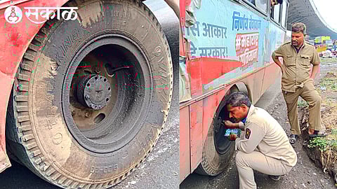 ते बसच्या डाव्या बाजूकडील मागच्या चाकाला बसविले. त्यानंतर ही बस नंदूरबारच्या दिशेने मार्गस्थ झाली. बसच्या मार्गाची (विंचूर-प्रकाशा) दुरवस्था झाली असून, वाहनांचा मोठ्या प्रमाणात घसारा होत असल्याचे चालकाने सांगितले.