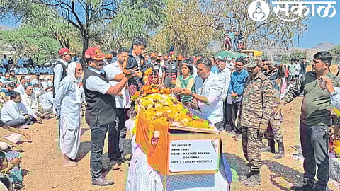 Nashik News : अमर रहे अमर रहे वीर जवान अमर रहे, भारत माता की जय, जय जवान जय किसान अशा घोषणा देत किकवारी खुर्द येथील वीरमरण आलेले जवान राकेश काकुळते यांच्यावर रविवारी (ता.१८) शासकीय इतमामात अंत्यसंस्कार करण्यात आले. आदर्श गाव किकवारी खुर्दनगरीने साश्रुनयनांनी आपल्या लाडक्या भूमिपुत्राला अखेरचा निरोप दिला. ( Nashik Veer Jawan Rakesh Kakulte marathi news )