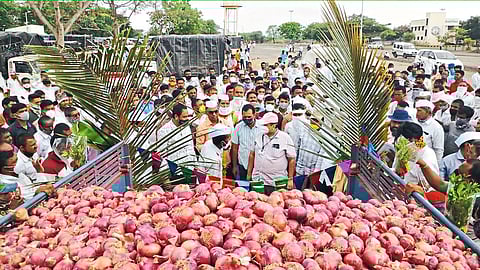 लासलगाव (जि. नाशिक) : आशिया खंडात अग्रेसर असलेल्या कांद्याच्या बाजारपेठेत ७५ वर्षांच्या इतिहासात गुरुवारी (ता. १०) अमावस्येच्या दिवशी कांद्याचे लिलाव करण्यात आले. या ऐतिहासिक घटनेनिमित्त आतषबाजी करण्यात आली. (onion auction was held in lasalgaon market committee with fireworks)