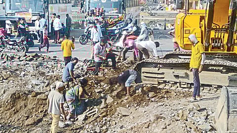 यात महिलांसह लहान मुलांचाही मोठ्या प्रमाणावर समावेश आहे. गत दोन वर्षांपासून स्मार्टसिटीतंर्गत गंगाघाटासह शहराच्या विविध भागात विकासकामे सुरू आहेत, दोन दिवसांपासून म्हसोबा पटांगणावर नियोजित रथमार्गासाठी जुना रस्ता खोदला जात आहे. यासाठी जेसीबी, पोकलॅन्ड मशिनसह अन्य मशिनरीचा वापर सुरू आहे.
