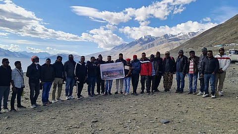 सर्वतीर्थ टाकेद (जि. नाशिक) : नवी मुंबई आंतरराष्ट्रीय विमानतळाला (Navi Mumbai Airport) लोकनेते दि. बा. पाटील यांचे नाव देण्याची मागणी पुन्हा जोर धरत आहे. भारतातील पर्यटनाचे आकर्षण बिंदू लेह-लडाख येथे दिनांक ५ ऑगस्ट रोजी एकत्र येत इगतपुरी येथील तरुणांनी दि. बा. पाटील यांच्या नावाचा बॅनर दाखवत त्यांच्या नावाचा जयघोष केला आणि लेह लडाखच्या कडेकपारीत दि. बा पाटील यांच्या नावाचा आवाज घुमला.