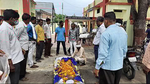 तिवसा (जि. अमरावती) : अगदीच नगरपंचायत कार्यालयाला लागून असलेल्या बौद्ध स्मशानभूमीत जाणाऱ्या रस्त्यावरील पूल पावसामुळे खचल्याने नागरिकांना मृत्यूदेहाची अंत्ययात्रा नगरपंचायतीच्या आतील परिसरातून न्यावी लागत आहे. त्यामुळे संतप्त झालेल्या नागरिकांनी शुक्रवारी चक्क कार्यालयाच्या गेटसमोर मृत्यूदेहाला विसावा देऊन आक्रोश व्यक्त केला. नगरपंचायत प्रशासनाने लवकरात लवकर पुलाचे काम करावे अशी मागणी सुद्धा अंत्ययात्रेत उपस्थित नागरिकांनी केली.