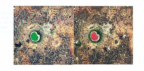 लोणार सरोवराच्या पाण्याचा रंग जूनच्या पहिल्या आठवड्यामध्ये अचानक बदलत लालसर गुलाबी झाल्याचे परिसरातील नागरिकांना लक्षात आले. त्यानंतर या पाण्याचे नमुने प्रशासनाने नागपूर येथील नीरी आणि पुण्यातील गोखले इन्स्टिट्यूटला निरिक्षणासाठी पाठविले. पृथ्वीचे निरीक्षण करणारी नासाची "नासा अर्थ ऑब्सर्व्हिंग सिस्टिम' ही एक स्वतंत्र प्रणाली कार्यरत आहे. या प्रणालीतील "लॅंडसेट 8' या उपग्रहाने सरोवराचा रंग बदलण्यापूर्वी (25 मे रोजी) आणि रंग बदलल्यानंतर (10 जून) चे छायाचित्र कैद केले आहे.