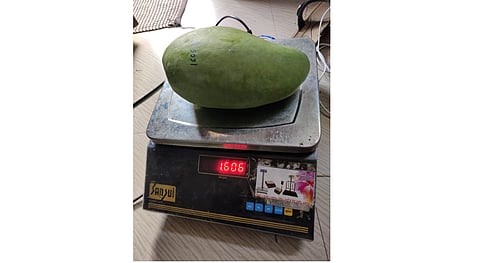 दिग्रस (जि. यवतमाळ) : उन्हाळा आणि अांबा यांचे नाते अतुट आहे. अलिकडे तर आंब्याच्या विविध जाती बाजारात उपलब्ध असतात. प्रत्येकाची चव,आकार,रंग निराळा. मात्र प्रत्येकाचीच चव हवीहवीशी. दिग्रस येथील शेतक-याच्या बागेत तर अद्भुत आंबे लागले आहेत. एका किलोत साधारणतः: चार तरी आंबे बसतात. मात्र, एक आंबा दीड किलोचा म्हटले की, कुणाचा विश्वास बसणार नाही. मात्र, हे खरे आहे. तालुक्यातील डेहणी येथील संतोष अटल यांच्या शेतातील बाटली आंबा चक्क एक किलो सहाशे ग्रॅमचा आहे. खायला चवदार आणि रुचकर असलेला हा आंबा रसाळ आहे. एकदा तरी चव चाखावी, असा हा आंबा बाजारात नेतानेताच संपतो असे सदर शेतकर्यांचे म्हणणे आहे.