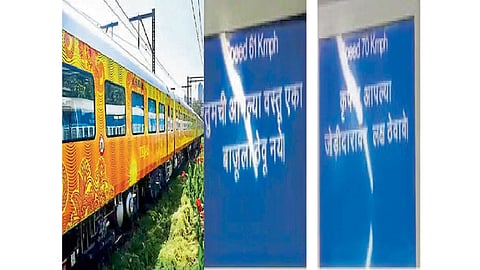 मुंबई-मडगाव तेजस एक्सप्रेसमध्ये प्रवासी सुविधा अंतर्गत डब्यांमध्ये फलक कार्यान्वित करण्यात आले आहेत. या स्क्रीनवर मराठी, हिंदी आणि इंग्रजी भाषेत सूचना देण्यात येतात. मात्र, तेजस एक्सप्रेसमध्ये हिंदी आणि इंग्रजीमधील सूचनांचे सरसकट भाषांतर करीत हा मजकूर वापरण्यात आल्याचे फोटो प्रसिद्ध झाले. यामध्ये ‘तुमचा प्रवास सुखाचा आणि सोयीचा हो ही भारतीय रेल्वेची शुभेच्छा, कृपया आपल्या जोडीदारावर लक्ष ठेवावे, तुमची आपली वस्तू एका बाजूला ठेवू नये’ अशा सूचना स्क्रीनवर झळकल्या. त्यामुळे, मराठी भाषाप्रेमींमध्ये रोष वाढला आहे.